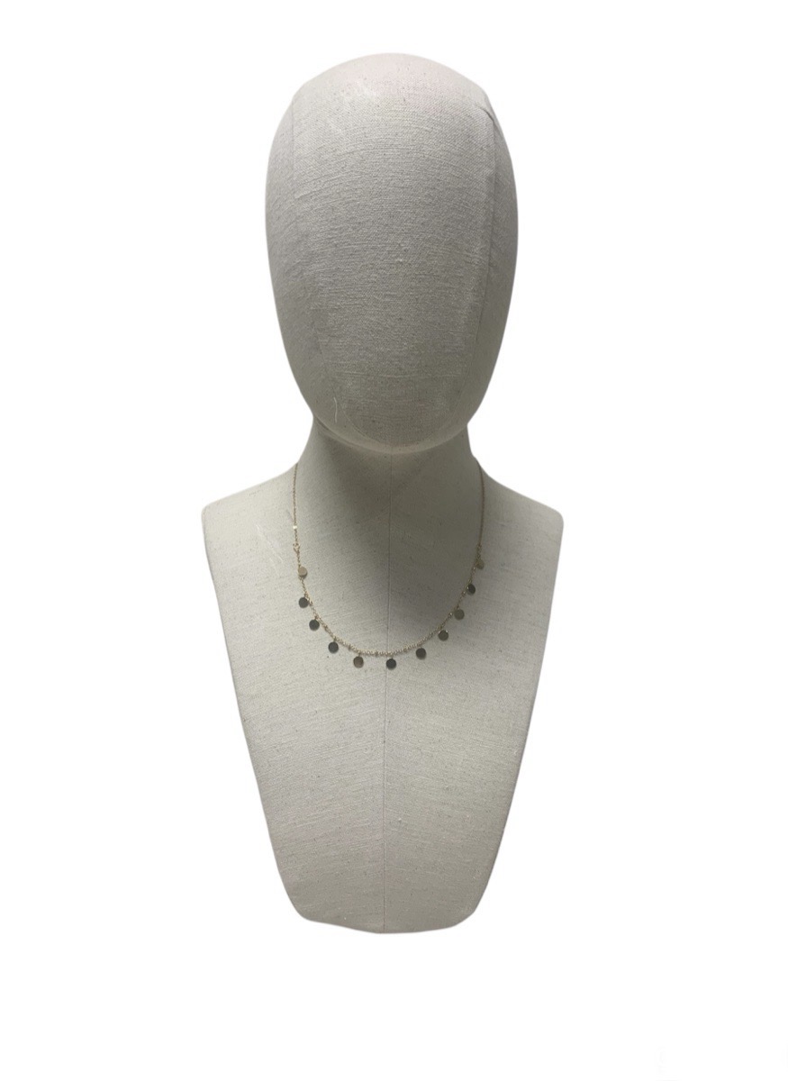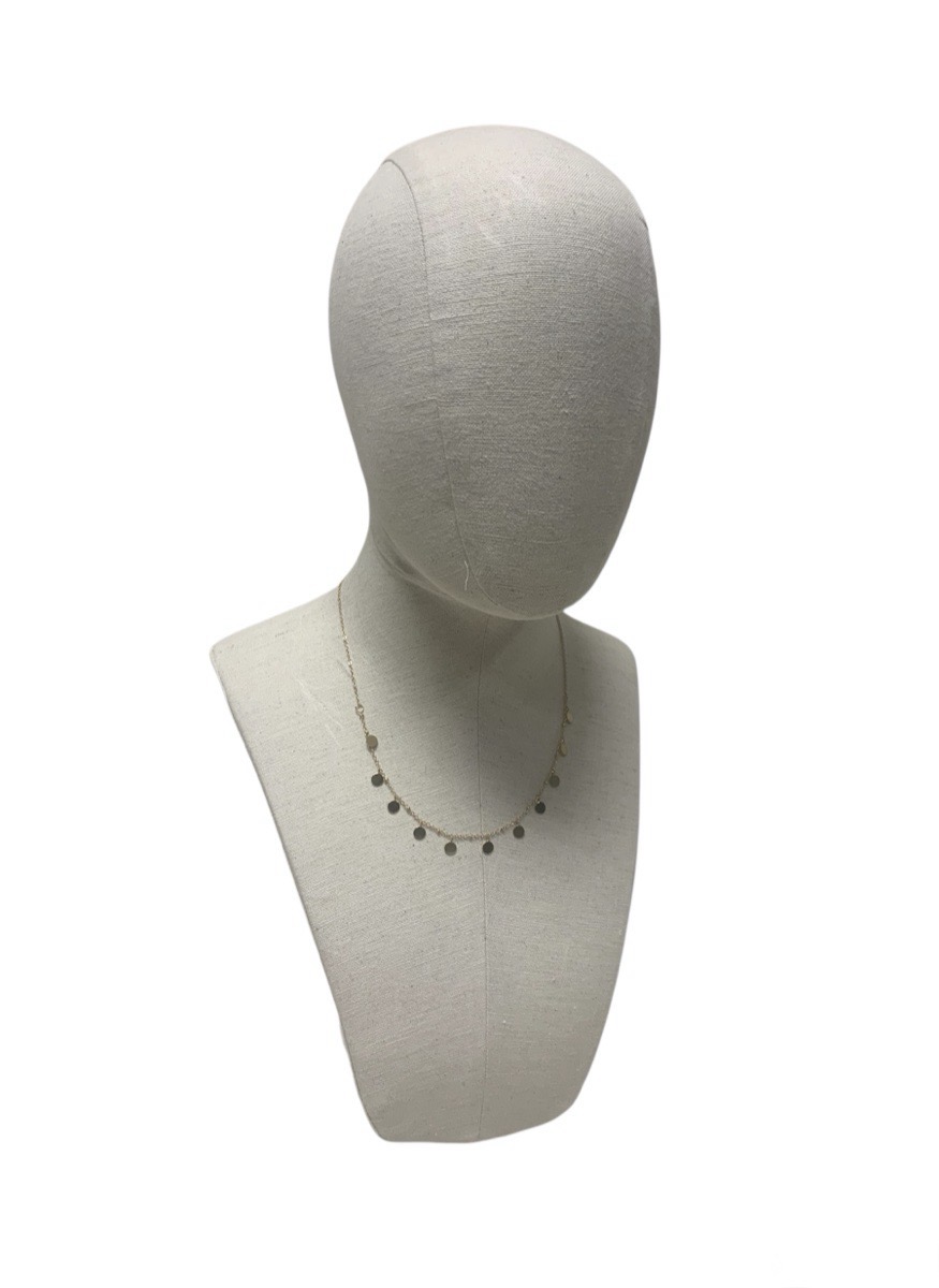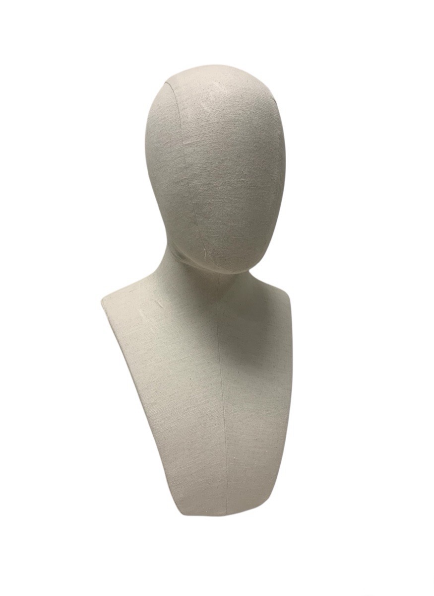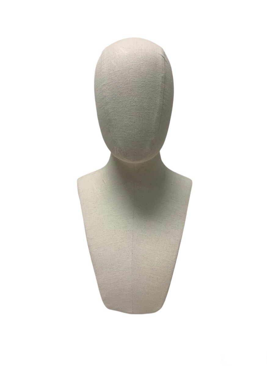 Expositor /peto de joyería mujer con cabeza Adapta. Especialmente indicado para collares y/o sombreros. Destacan los accesorios con su diseño sencillo y elegante. Forrado en lino y con base metálica.