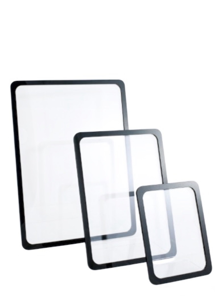 Porta cartel, porta folleto, porta precio transparente con marco de color negro, para sobremesa. 18x24cm.