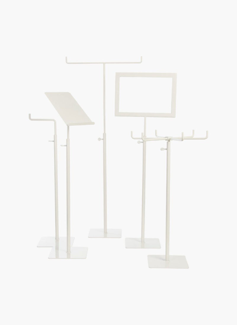 Expositor de sobremesa para bolsos u otros complementos, graduable de 42 a 77cm. Acabado hierro pintado blanco.