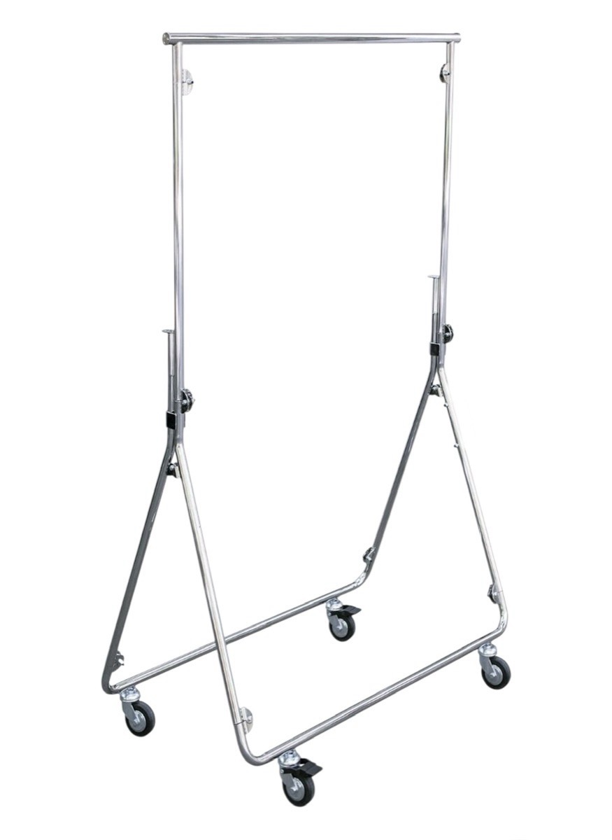 Soporte de confección plegable con altura fija de 157cm y ancho de 98 a 155cm. Se trata de un soporte que aguanta grandes cargas debido a su estructura y resistente gracias a la sus ruedas de goma que te permiten desplazarlo por cualquier superficie, incluso la calle. Su forma plegable hace que sea ideal para ferias, pop up stores o puestos efímeros.